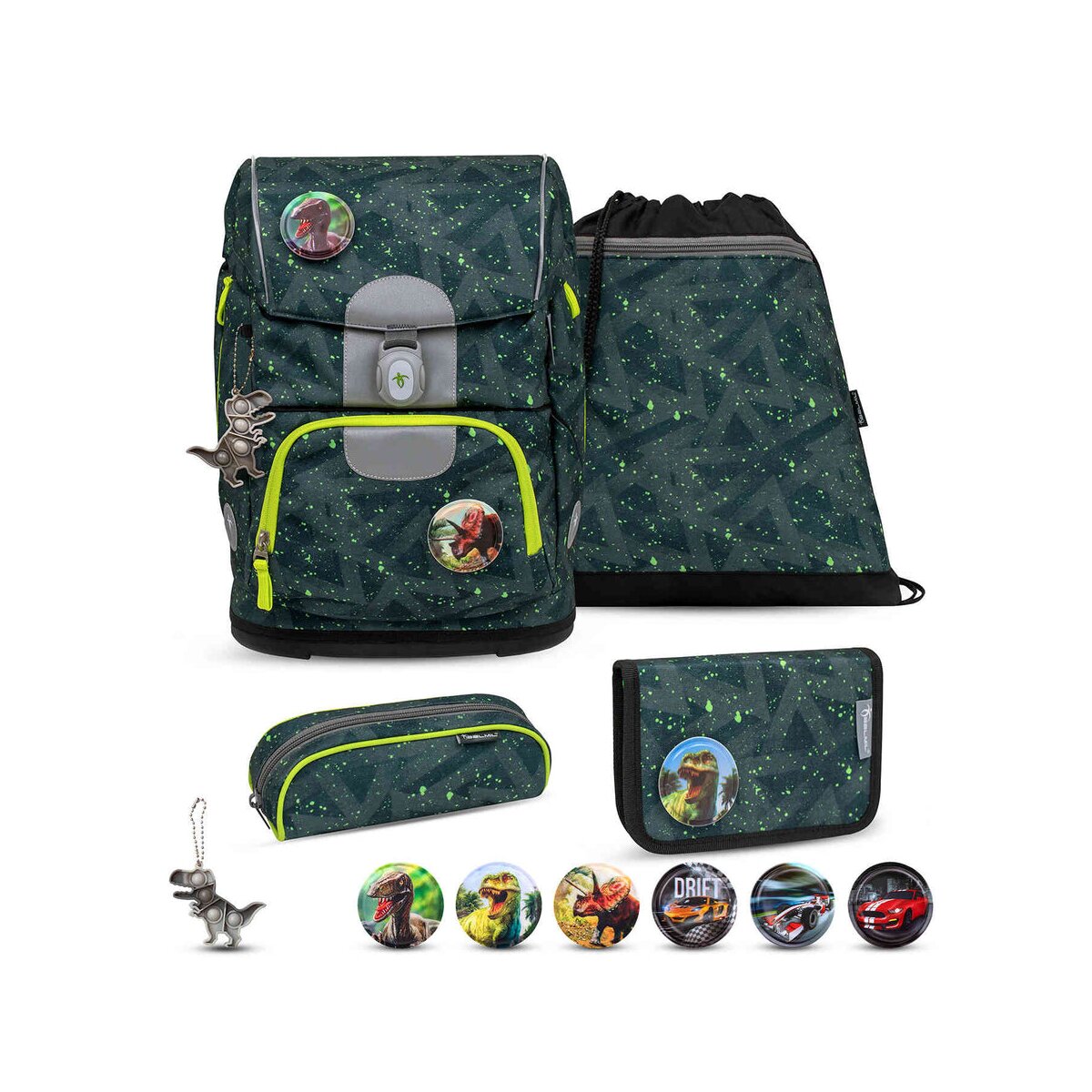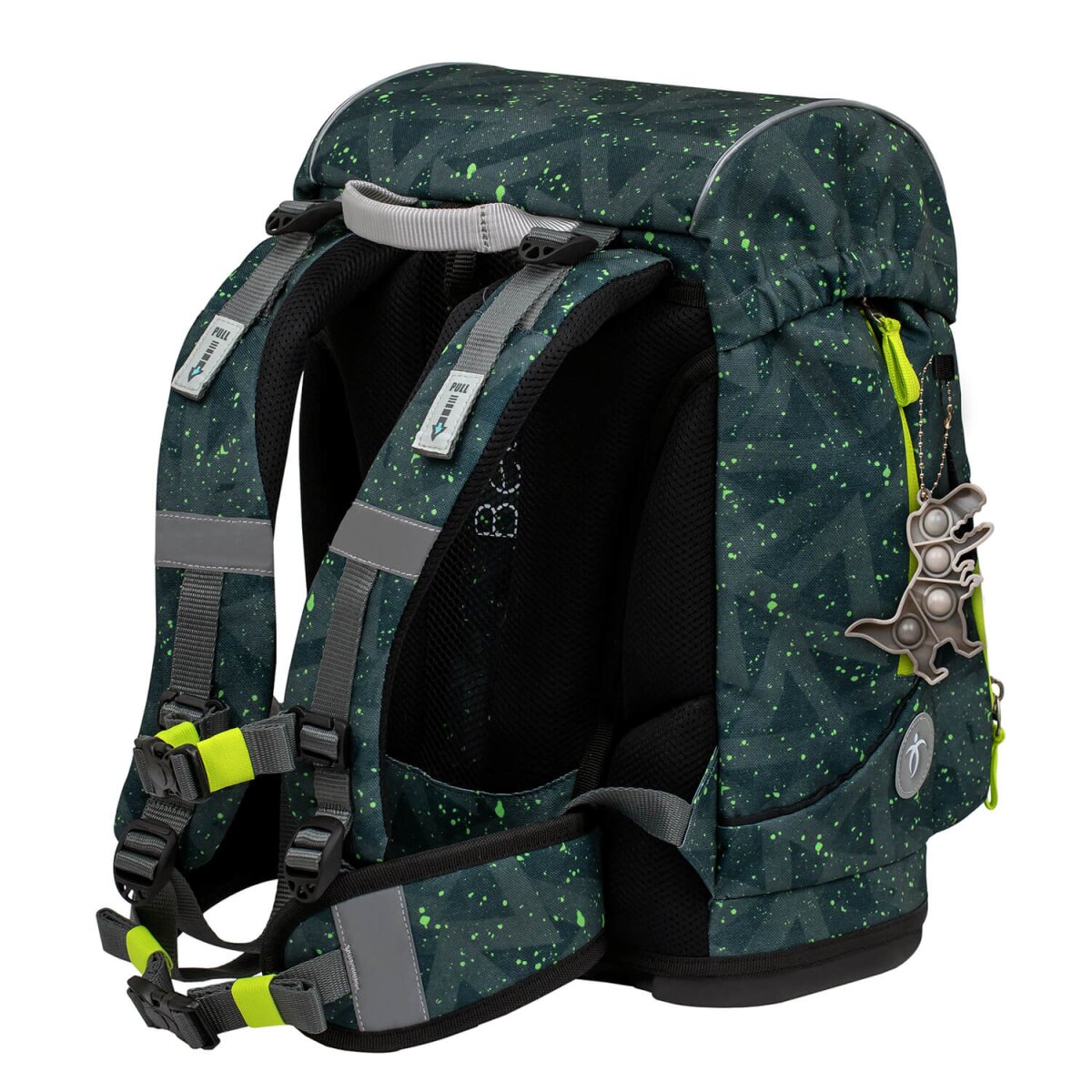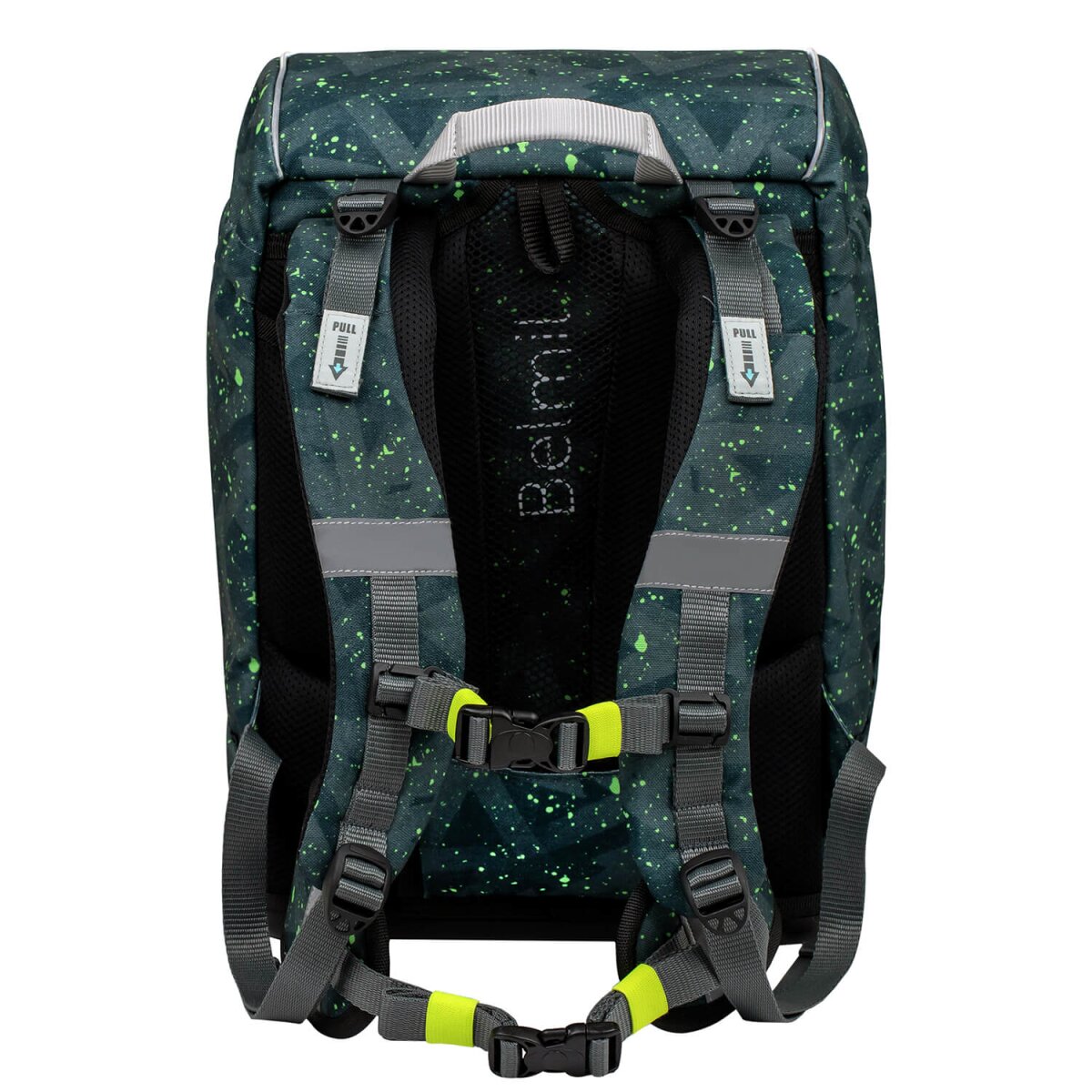 Belmil Motion ergonomisches Schulranzen Set 5-teilig "Green Splash" aus recyceltem Material mit Brustgurt, Hüftgurt, Magnetverschluss, Patch Set 6 Stück